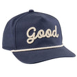 The Good Good Golf Saddle Up Rope Hat features a structured five-panel design. It includes a curved brim for sun protection. A rope detail runs across the front panel for a classic rope hat look. The adjustable snapback closure provides a secure fit.